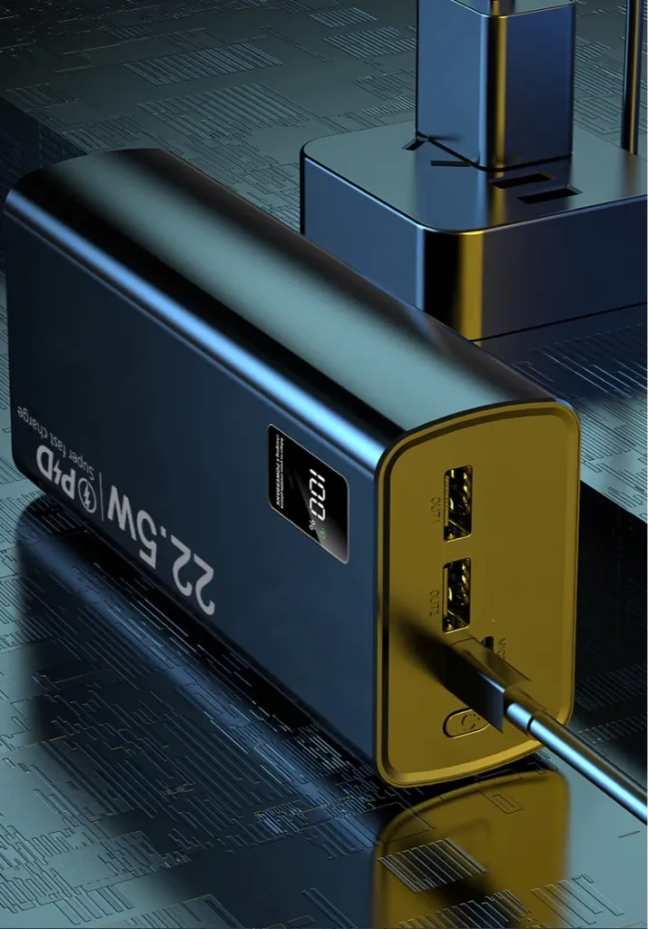 Despite its large capacity, the power bank is designed to be lightweight and compact, making it easy to carry in a bag or pocket.